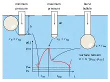Due to internal attractive forces of a liquid, air bubbles within the liquids are compressed. The resulting pressure (bubble pressure) rises at a decreasing bubble radius. The bubble pressure method makes use of this bubble pressure which is higher than in the surrounding environment (water). A gas stream is pumped into a capillary that is immersed in a fluid. The resulting bubble at the end of the capillary tip continually becomes bigger in surface; thereby, the bubble radius is decreasing.