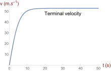 Based on air resistance, for example, the terminal speed of a skydiver in a belly-to-earth (i.e., face down) free fall position is about 55 m/s (180 ft/s).[3] This speed is the asymptotic limiting value of the speed, and the forces acting on the body balance each other more and more closely as the terminal speed is approached. In this example, a speed of 50% of terminal speed is reached after only about 3 seconds, while it takes 8 seconds to reach 90%, 15 seconds to reach 99% and so on.