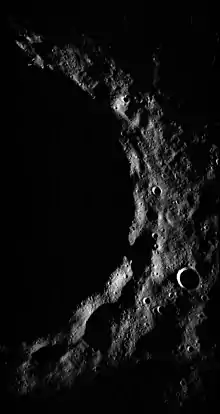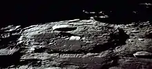 The lunar terminator is the division between the illuminated and dark hemispheres of the Moon.[6] It is the lunar equivalent of the division between night and day on the Earth spheroid, although the Moon's much lower rate of rotation[7] means it takes longer for it to pass across the surface. At the equator, it moves at 15.4 kilometres per hour (9.6 mph), as fast as an athletic human can run on earth.
