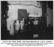 In the 1950s, Warren Rice attempted to recreate Tesla's experiments, but he did not perform these early tests on a pump built strictly in line with Tesla's patented design (it, among other things, was not a Tesla multiple staged turbine nor did it possess Tesla's nozzle).[13] Rice's experimental single-stage system's working fluid was air. Rice's test turbines, as published in early reports, produced an overall measured efficiency of 36–41% for a single stage.[13] Higher efficiency would be expected if designed as originally proposed by Tesla.
