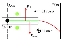 Bucherer's experimental setup for measuring the specific charge e/m of β electrons as a function of their speed v/c. (Cross-section through the axis of a circular capacitor with a beta-source at its center, at an angle α with respect to the magnetic field H)