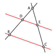 Proclus attributes to Thales the discovery that a circle is bisected by its diameter, that the base angles of an isosceles triangle are equal and that vertical angles are equal.[55] Two fundamental theorems of elementary geometry are customarily called Thales's theorem: one of them has to do with a triangle inscribed in a circle and having the circle's diameter as one side;[55] the other, also called the intercept theorem, is about an angle intercepted by two parallel lines, forming a pair of similar triangles.