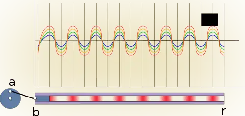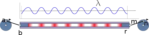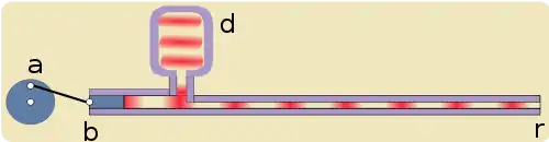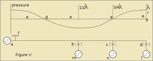 ![]() Figure III If instead of a closed end we have a piston at r; the wave will be similar at piston b and piston m, the piston m therefore will have the same energy as the piston b; if the distance between the b and m is not a multiple of λ, the movement of m will differ in phase compared with the piston b. | |