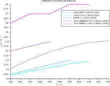 In the table below, the range for α is from 10−7 K−1 for hard solids to 10−3 K−1 for organic liquids. The coefficient α varies with the temperature and some materials have a very high variation; see for example the variation vs. temperature of the volumetric coefficient for a semicrystalline polypropylene (PP) at different pressure, and the variation of the linear coefficient vs. temperature for some steel grades (from bottom to top: ferritic stainless steel, martensitic stainless steel, carbon steel, duplex stainless steel, austenitic steel). The highest linear coefficient in a solid has been reported for a Ti-Nb alloy.[7]