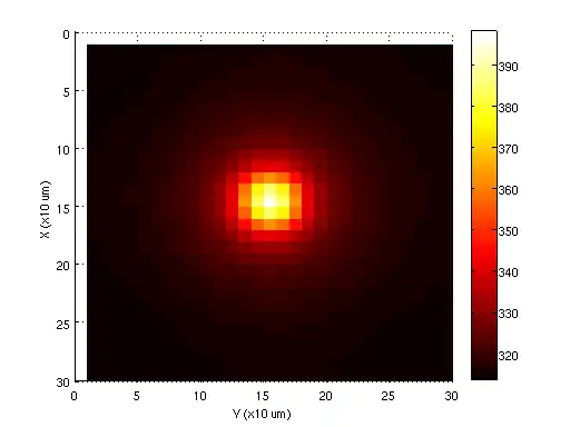 For more details about the derivation, please see Prof. Batty's paper,.[2] The below figure shows the steady state temperature distribution of this analytical method for a cubic die, with dimensions 300 um. A constant power source of 0.3W is applied over a central surface of dimension 0.1L x 0.1L. As expected, the distribution decays as it approaches to the boundaries, its maximum is located at the center and almost reaches 400K