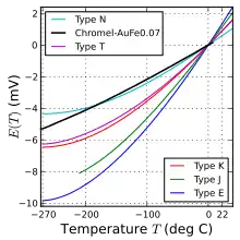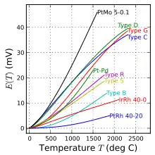 Characteristic functions for thermocouples that reach intermediate temperatures, as covered by nickel-alloy thermocouple types E, J, K, M, N, T. Also shown are the noble-metal alloy type P and the pure noble-metal combinations gold–platinum and platinum–palladium.