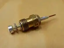Thermocouple connection in gas appliances. The end ball (contact) on the left is insulated from the fitting by an insulating washer. The thermocouple line consists of copper wire, insulator and outer metal (usually copper) sheath which is also used as ground.[30]