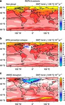 In 2022, an extensive assessment of all potential climate tipping points identified 16 plausible climate tipping points, including a collapse of the AMOC. It suggested that a collapse would most likely be triggered by 4 °C (7.2 °F) of global warming, but that there's enough uncertainty to suggest it could be triggered at warming levels as low as 1.4 °C (2.5 °F), or as high as 8 °C (14 °F). Likewise, it estimates that once AMOC collapse is triggered, it would most likely take place over 50 years, but the entire range is between 15 and 300 years.[36][37] That assessment also treated the collapse of the Northern Subpolar Gyre as a potential separate tipping point, which could occur at between 1.1 °C (2.0 °F) degrees and 3.8 °C (6.8 °F) (although this is only simulated by a fraction of climate models). The most likely figure is 1.8 °C (3.2 °F), and once triggered, the collapse of the gyre would most likely take 10 years from start to end, with a range between 5 and 50 years. The loss of this convection is estimated to lower the global temperature by 0.5 °C (0.90 °F), while the average temperature in Europe decreases by around 3 °C (5.4 °F). There are also substantial impacts on regional precipitation.[36][37]While there is not yet consensus on whether there has already been a consistent slowdown in AMOC circulation, there is little doubt that it would occur in the future under continued climate change.[38] According to the IPCC, the most likely impacts of future AMOC decline are the reduced precipitation in mid-latitudes, changing patterns of strong precipitation in the tropics and Europe, and strengthening storms that follow the North Atlantic track. Similarly, decline would also be accompanied by an acceleration of sea level rise along the U.S. East Coast:[38] with at least one such event already connected to a temporary AMOC downturn.[39] This effect would be caused by the increased warming and thus thermal expansion of coastal waters, since they would transfer less of their heat towards Europe. It is one of the reasons why sea level rise in that area is estimated to be 3–4 higher than the global average.[40][41][42]