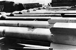 "Thin Man" plutonium gun test casings at Wendover Army Air Field, as part of Project Alberta in the Manhattan Project. "Fat Man" casings can be seen behind them.