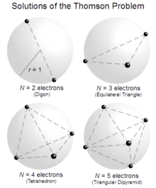 - For N = 5, a mathematically rigorous computer-aided solution was reported in 2010 with electrons residing at vertices of a triangular dipyramid.[4] Of interest, it is impossible for any N solution with five or more electrons to exhibit global equidistance among all pairs of electrons.