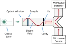 The experiment relies upon the interaction between optically-generated charge carriers and microwave frequency electromagnetic radiation. The most common approach is to use a resonant cavity.[8] An oscillating voltage is produced using a signal generator such as a voltage controlled oscillator or a Gunn diode. The oscillating current is incident on an antenna, resulting in the emission of microwaves of the same frequency. These microwaves are then directed into a resonant cavity. Because they can transmit microwaves with lower loss than cables,[9] metallic waveguides are often used to form the circuit.[10] With the appropriate cavity dimensions and microwave frequency, a standing wave can be formed with 1 full wavelength filing the cavity.
