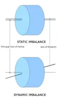 To a first approximation, which neglects deformations due to its elasticity, the wheel is a rigid rotor that is constrained to rotate about its axle. If a principal axis of the wheel's moment of inertia is not aligned with the axle, due to an asymmetric mass distribution, then an external torque, perpendicular to the axle, is necessary to force the wheel to rotate about the axle. This additional torque must be provided by the axle and its orientation rotates continuously with the wheel. The reaction to this torque, by Newton's Third Law is applied to the axle, which transfers it to the suspension and can cause it to vibrate. Automotive technicians can reduce this vibration to an acceptable level when balancing the wheel by adding small masses to the inner and outer wheel rims that bring the principal axis into alignment with the axle.