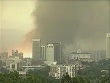 There are several scales for rating the strength of tornadoes. The Fujita scale rates tornadoes by damage caused and has been replaced in some countries by the updated Enhanced Fujita Scale. An F0 or EF0 tornado, the weakest category, damages trees, but not substantial structures. An F5 or EF5 tornado, the strongest category, rips buildings off their foundations and can deform large skyscrapers. The similar TORRO scale ranges from T0 for extremely weak tornadoes to T11 for the most powerful known tornadoes.[10] The International Fujita scale is also used to rate the intensity of tornadoes and other wind events based on the severity of the damage they cause.[11] Doppler radar data, photogrammetry, and ground swirl patterns (trochoidal marks) may also be analyzed to determine intensity and assign a rating.[12][13]
