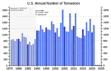 The United States averages about 1,200 tornadoes per year, followed by Canada, averaging 62 reported per year.[80] NOAA's has a higher average 100 per year in Canada.[81] The Netherlands has the highest average number of recorded tornadoes per area of any country (more than 20, or 0.00048/km2, 0.0012/sq mi annually), followed by the UK (around 33, 0.00013/km2, 0.00034/sq mi per year), although those are of lower intensity, briefer[82][83] and cause minor damage.[76]