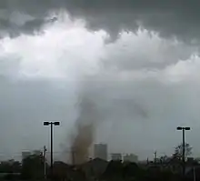 A tornado is a violently rotating column of air, in contact with the ground, either pendant from a cumuliform cloud or underneath a cumuliform cloud, and often (but not always) visible as a funnel cloud.[18] For a vortex to be classified as a tornado, it must be in contact with both the ground and the cloud base. The term is not precisely defined; for example, there is disagreement as to whether separate touchdowns of the same funnel constitute separate tornadoes.[5] Tornado refers to the vortex of wind, not the condensation cloud.[19][20]