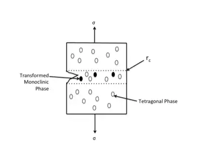 The TRIP effect is found in partially stabilized zirconia. Partially stabilized zirconia is composed of tetragonal phase at high temperature and monoclinic phase and cubic phase at lower temperature in equilibrium. In some components, the onset temperature of tetragonal monoclinic martensite transformation is lower than room temperature. The stress field near the crack tip triggers the martensitic transformation at velocities hypothesized to approach that of sound in the material.[12] The martensitic transformation causes volume expansion (volumetric/ dilatational strain) and shear strains of about 4% and 16% respectively. It applies compressive stress at the crack tip to prevent crack propagation as well as closure tractions at the crack wake.[13] From another point of view, the work associated to this phase transformation contributes to the improvement of toughness. The increment of toughness caused by transformation toughening can be expressed by:[1]
