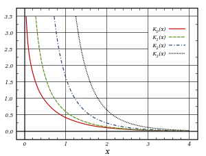 Modified Bessel functions of the second kind, Kα(x), for α = 0, 1, 2, 3