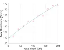Since all components of can be calculated and the components of are provided by the resistance measurements, the coefficients and can be calculated. Finally from the two coefficients, the values for , and the specific contact resistivity can be calculated as well. A plot to the left shows the measured resistance values in dependence of the gap length together with the fitting function corresponding to the determined coefficients and .