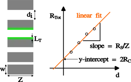 In the image to the right the distance between the pads increases from the bottom to the top. Therefore, when the resistance between adjacent pads is measured the total resistance increases accordingly as it is indicated in the graph beneath the depiction of the metal pads. In this graph the abscissa represents the distance between two adjacent metal pads while the circles represent measured resistance values. The total resistivity can be separated into a component due to the uncovered semiconductor substrate and a component that corresponds to the voltage drop in two metal-covered areas. The former component can be described with the formula , whereas represents the sheet resistance of the semiconductor substrate and the width of the metal pads. The other component that contributes to the total resistance is denoted by because when two adjacent pads are characterized two identical metallized areas have to be considered. This means that the total resistance can be written in the following functional form, with the pad distance as independent variable: