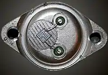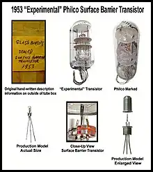 The first high-frequency transistor was the surface-barrier germanium transistor developed by Philco in 1953, capable of operating at frequencies up to 60 MHz.[30] They were made by etching depressions into an n-type germanium base from both sides with jets of indium(III) sulfate until it was a few ten-thousandths of an inch thick. Indium electroplated into the depressions formed the collector and emitter.[31][32]