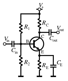 An amplifier circuit, a common-emitter configuration with a voltage-divider bias circuit