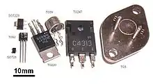 Size comparison of bipolar junction transistor packages, including (from left to right): SOT-23, TO-92, TO-126, and TO-3