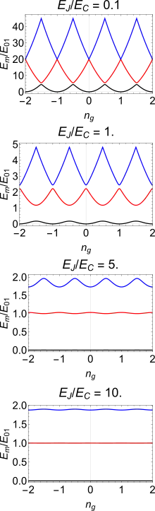 The benefit of increasing the ratio is the insensitivity to charge noise—the energy levels become independent of the offset charge across the junction; thus the dephasing time of the qubit is prolonged. The disadvantage is the reduced anharmonicity , where is the energy difference between eigenstates and . Reduced anharmonicity complicates the device operation as a two level system, e.g. exciting the device from the ground state to the first excited state by a resonant pulse also populates the higher excited state. This complication is overcome by complex microwave pulse design, that takes into account the higher energy levels, and prohibits their excitation by destructive interference. Also, while the variation of with respect to tend to decrease exponentially with , the anharmonicity only has a weaker, algebraic dependence on as . The significant gain in the coherence time outweigh the decrease in the anharmonicity for controlling the states with high fidelity.