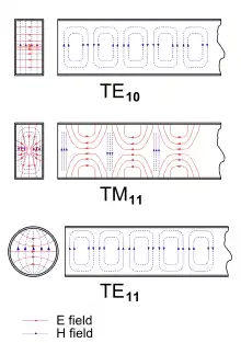 In rectangular waveguides, rectangular mode numbers are designated by two suffix numbers attached to the mode type, such as TEmn or TMmn, where m is the number of half-wave patterns across the width of the waveguide and n is the number of half-wave patterns across the height of the waveguide. In circular waveguides, circular modes exist and here m is the number of full-wave patterns along the circumference and n is the number of half-wave patterns along the diameter.[2][3]