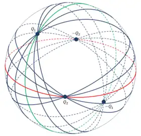 Coulomb fluids consist of dipolar particles and are modelled by means of direct numerical simulations. It is commonly used to choose cubic cells with periodic boundary conditions in conjunction with Ewald summation techniques. In a more efficient alternative method pursued by,[15][16] one employs as a simulation cell the hyper spherical surface in (4). As already mentioned above, the basic object on is the electric charge dipole, termed to as "bi-charge" in fluid dynamics, which can be visualized classically as a rigid "dumbbell" (rigid rotator) of two antipodal charges of opposite signs, and . The potential of a bi-charge is calculated by solving on the Poisson equation,
