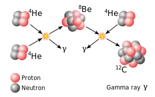 Nuclear fusion reaction of two helium-4 nuclei produces beryllium-8, which is highly unstable, and decays back into smaller nuclei with a half-life of 8.19×10−17 s, unless within that time a third alpha particle fuses with the beryllium-8 nucleus[3] to produce an excited resonance state of carbon-12,[4] called the Hoyle state, which nearly always decays back into three alpha particles, but once in about 2421.3 times releases energy and changes into the stable base form of carbon-12.[5] When a star runs out of hydrogen to fuse in its core, it begins to contract and heat up. If the central temperature rises to 108 K,[6] six times hotter than the Sun's core, alpha particles can fuse fast enough to get past the beryllium-8 barrier and produce significant amounts of stable carbon-12.