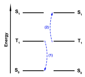 Triplet-triplet annihilation (TTA) is an energy transfer mechanism where two molecules in their triplet excited states interact to form a ground state molecule and an excited molecule in its singlet state.[1] This mechanism is example of Dexter energy transfer mechanism.[2] In triplet-triplet annihilation, one molecule transfers its excited state energy to the second molecule, resulting in the first molecule returning to its ground state and the second molecule being promoted to a higher excited singlet state.[1]