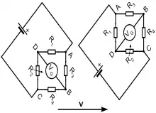 Frederick Thomas Trouton, (after conducting the Trouton–Noble experiment in 1903), instead did the calculations using his own interpretation of electrodynamics, calculating the length contraction according to the velocity of the experimental apparatus in the aether frame, but calculating the electrodynamics by applying Maxwell's equations and Ohm's law in the lab frame. According to Trouton's view of electrodynamics, the calculations then predicted a measurable effect of the length contraction in the lab frame. Together with Alexander Oliver Rankine, he set out to verify this in 1908 by attempting to measure the change of the resistance of a coil as it changed its orientation to the "aether velocity" (the velocity of the lab through the luminiferous aether). This was done by putting four identical coils in a Wheatstone bridge configuration which allowed them to precisely measure any change in resistance. The circuit was then rotated 90 degrees about its axis as the resistance was measured. Because the Lorentz–FitzGerald contraction is only in the direction of motion, from the point of view of the "Aether frame" the length of the coils depended on their angle with respect to their Aether velocity. Trouton and Rankine therefore believed that the resistance as measured in the rest frame of the experiment should change as the device was rotated. However their careful measurements showed no detectable change in resistance.[1][2]