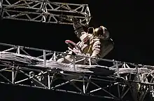 Cosmonaut Alexander Serebrov sets up an integrated truss structure "Rapana" at Mir space station, September 16, 1993