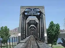 The Southern Pacific Railroad bridge in Tempe, Arizona is a 393 meter (1,291 foot) long truss bridge built in 1912.[22][23] The structure is composed of nine Pratt truss spans of varying lengths. The bridge is still in use today.