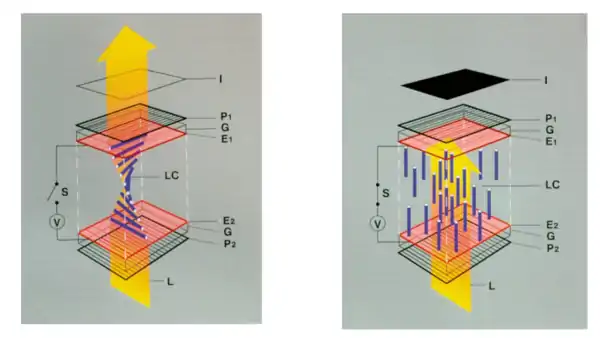 Wolfgang Helfrich, a physicist who joined RCA in 1967, became interested in Mauguin's twisted structure and thought it might be used to create an electronic display. However RCA showed little interest because they felt that any effect that used two polarizers would also have a large amount of light absorption, requiring it to be brightly lit. In 1970, Helfrich left RCA and joined the Central Research Laboratories of Hoffmann-LaRoche in Switzerland, where he teamed up with Martin Schadt, a solid-state physicist. Schadt built a sample with electrodes and a twisted version of a liquid-crystal material called PEBAB (p-ethoxybenzylidene-p'-aminobenzonitrile), which Helfrich had reported in prior studies at RCA, as part of their guest-host experiments.[1] When voltage is applied, PEBAB aligns itself along the field, breaking the twisting structure and the redirection of the polarization, making the cell turn opaque.