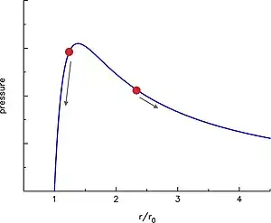 Equilibria are also possible in which both balloons have the same size. If the total quantity of air in both balloons is less than Np, defined as the number of molecules in both balloons if they both sit at the peak of the pressure curve, then both balloons settle down to the left of the pressure peak with the same radius, r < rp. On the other hand, if the total number of molecules exceeds Np, the only possible equilibrium state is the one described above, with one balloon on the left of the peak and one on the right. Equilibria in which both balloons are on the right of the pressure peak also exist but are unstable.[4] This is easy to verify by squeezing the air back and forth between two interconnected balloons.