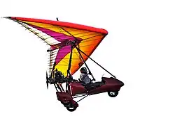 An ultralight trike or paratrike is a type of powered hang glider where flight control is by weight-shift.[1] These aircraft have a fabric flex-wing from which is suspended a tricycle fuselage pod driven by a pusher propeller. The pod accommodates either a solo pilot, or a pilot and a single passenger. Trikes grant affordable, accessible, and exciting flying, and have been popular since the 1980s.