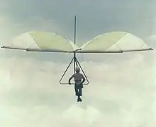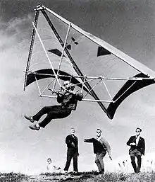 An influence through John Dickenson's duplication of his device,[10][11] who named his flexible-wing ski-kite the Ski Wing.[12] Dickenson fashioned a water ski kite airframe to fit on a Rogallo airfoil[11][13][14][15] where the pilot sat on a swinging seat while the control frame and wire bracing distributed the load to the wing as well as gave a frame freedom to be pushed/pulled for weight-shift control.[16] Dickenson's Ski Wing turned out to be stable and controllable under tow,[17] unlike the flat manned kites used at water ski shows. The Ski Wing kite was first kited in public at the Grafton Jacaranda Festival in September 1963 by Rod Fuller while towed behind a motorboat. Australian manufacturers like Bill Bennett[18] and Bill Moyes,[19][20] actively developed and marketed Dickenson's innovations[21] to the world, which significantly fueled the hang glider revolution.