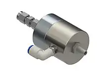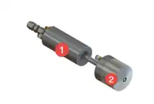 An atomized spray produced from an ultrasonic nozzle is subjected to a heated substrate typically ranging from 300–400 degrees C.[23] Due to the high temperatures of the spray chamber, extensions to the ultrasonic nozzle (as pictured and labeled – High Temperature Ultrasonic Nozzle) such as a removable tip (tip is hidden under the vortex air shroud labeled #2) have been designed to be subjected to high temperatures while protecting the body (labeled #1) of the ultrasonic nozzle that contains temperature sensitive piezoelectric elements, typically outside of the spray chamber or by other means of isolation.[24]
