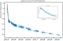 V339 Delphini or Nova Delphini 2013 (PNV J20233073+2046041) is a bright nova star in the constellation Delphinus. It was discovered on 14 August 2013 by amateur astronomer Koichi Itagaki in Japan and confirmed by the Liverpool Telescope on La Palma. The nova appeared with a magnitude 6.8 when it was discovered and peaked at magnitude 4.3 on 16 August 2013.[4][5][6] A nova is produced by the fusion of accumulated material on the white dwarf nova progenitor acquired from its companion star. The nova system is thus a binary star, and a classical nova.[7] The white dwarf is a carbon-oxygen white dwarf,[8] with an estimated mass of 1.04±0.02 M☉.[9] There is not yet a consensus about what the binary's orbital period is; estimates range from 3.15 hours[10] to 6.43 hours.[9]