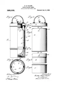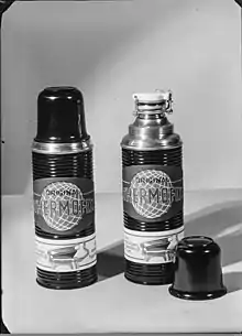 Dewar's design was quickly transformed into a commercial item in 1904 as two German glassblowers, Reinhold Burger and Albert Aschenbrenner, discovered that it could be used to keep cold drinks cold and warm drinks warm and invented a more robust flask design, which was suited for everyday use.[2][3] The Dewar flask design had never been patented but the German men who discovered the commercial use for the product named it Thermos, and subsequently claimed both the rights to the commercial product and the trademark to the name. In his subsequent attempt to claim the rights to the invention, Dewar instead lost a court case to the company.[4] The manufacturing and performance of the Thermos bottle was significantly improved and refined by the Viennese inventor and merchant Gustav Robert Paalen, who designed various types for domestic use, which he also patented, and distributed widely, through the Thermos Bottle Companies in the United States, Canada and the UK, which bought licences for respective national markets. The American Thermos Bottle Company built up a mass production in Norwich, CT, which brought prices down and enabled the wide distribution of the product for at-home use.[2] Over time, the company expanded the size, shapes and materials of these consumer products, primarily used for carrying coffee on the go and carrying liquids on camping trips to keep them either hot or cold. Eventually other manufacturers produced similar products for consumer use.
