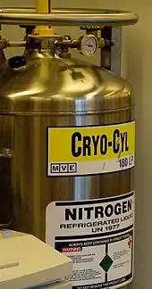 A cryogenic storage dewar of liquid nitrogen, used to supply a cryogenic freezer