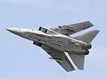 Despite this head start in the field, development of the F-111 was protracted; flight testing of the F-111A model only ended in 1973.[27] During 1968, cracks were discovered in the F-111's wing attach points, the issue also has been attributed with the loss of an F-111 in the following year.[28] Accordingly, the attach points were structurally redesigned and subject to intensive testing of both the design and manufacturing quality.[29] The F-111B, intended for the US Navy, was cancelled in 1968 due the aircraft's weight and performance issues, as well as its inadequacies for the service's fighter requirements.[30][31] Several variants, such as the FB-111A strategic bomber model, featured elongated wings to give a greater range and load-carrying capability.[32] The F-111's wing featured pivoting pylons (two under each wing) which automatically adjusted to the sweep angle. Subsequent swing-wing aircraft, such as the Panavia Tornado and Sukhoi Su-24, would also be similarly equipped.
