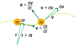 Kinematic quantities of a classical particle: mass m, position r, velocity v, acceleration a.
