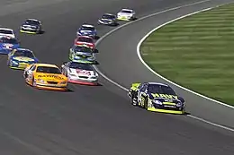 As a change of direction occurs while the racing cars turn on the curved track, their velocity is not constant even if their speed is.
