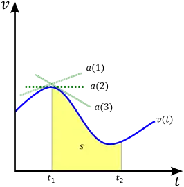 Example of a velocity vs. time graph, and the relationship between velocity v on the y-axis, acceleration a (the three green tangent lines represent the values for acceleration at different points along the curve) and displacement s (the yellow area under the curve.)