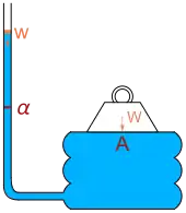 The Flemish scientist Simon Stevin was the first to explain the paradox mathematically.[4] In 1916 Richard Glazebrook mentioned the hydrostatic paradox as he described an arrangement he attributed to Pascal: a heavy weight W rests on a board with area A resting on a fluid bladder connected to a vertical tube with cross-sectional area α. Pouring water of weight w down the tube will eventually raise the heavy weight. Balance of forces leads to the equation