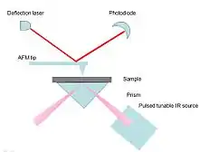 In the first developed setup of AFM-IR, a sample is mounted onto an infrared-transparent zinc selenide prism for excitation purposes (Figure 12), then an optical parametric oscillator (OPO)-based tunable IR lased is radiated on the molecules to be probed by the instrument. Similar to conventional ATR spectroscopy, IR beam illuminates the sample through total internal reflection mechanism (Figure 12). The sample will heat up while absorbing radiation which causes a rapid thermal expansion of the sample surface.[40][44] This expansion will increase the resonant oscillations of the AFM cantilever in a characteristic ringdown pattern (ringdown patterns means the decay of cantilever oscillation exponential in nature[44]). Through Fourier transformation analysis, the signal could be isolated to obtain the amplitudes and frequencies of the oscillations. The amplitudes of the cantilever provide information of local absorption spectra, whereas the oscillation frequencies depend on the mechanical stiffness of the sample (Figure 12).[43][44]