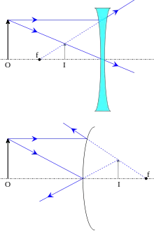 - A diverging lens (one that is thicker at the edges than the middle) or a convex mirror forms a virtual image. Such an image is reduced in size when compared to the original object. A converging lens (one that is thicker in the middle than at the edges) or a concave mirror is also capable of producing a virtual image if the object is within the focal length. Such an image will be magnified. In contrast, an object placed in front of a converging lens or concave mirror at a position beyond the focal length produces a real image. Such an image will be magnified if the position of the object is within twice the focal length, or else the image will be reduced if the object is further than this distance.