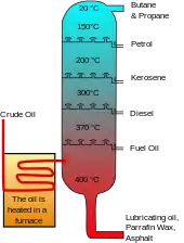 The process of petroleum refinement utilizes a technique known as fractional distillation, which allows several chemicals of varying volatility to be separated in a single step. Crude oil entering a refinery is composed of many useful chemicals that need to be separated. The crude oil flows into a distillation tower and is heated up, which allows the more volatile components such as butane and kerosene to vaporize. These vapors move up the tower and eventually come in contact with cold surfaces, which causes them to condense and be collected. The most volatile chemical condense at the top of the column while the least volatile chemicals to vaporize condense in the lowest portion.[1] On the right is a picture illustrating the design of a distillation tower.